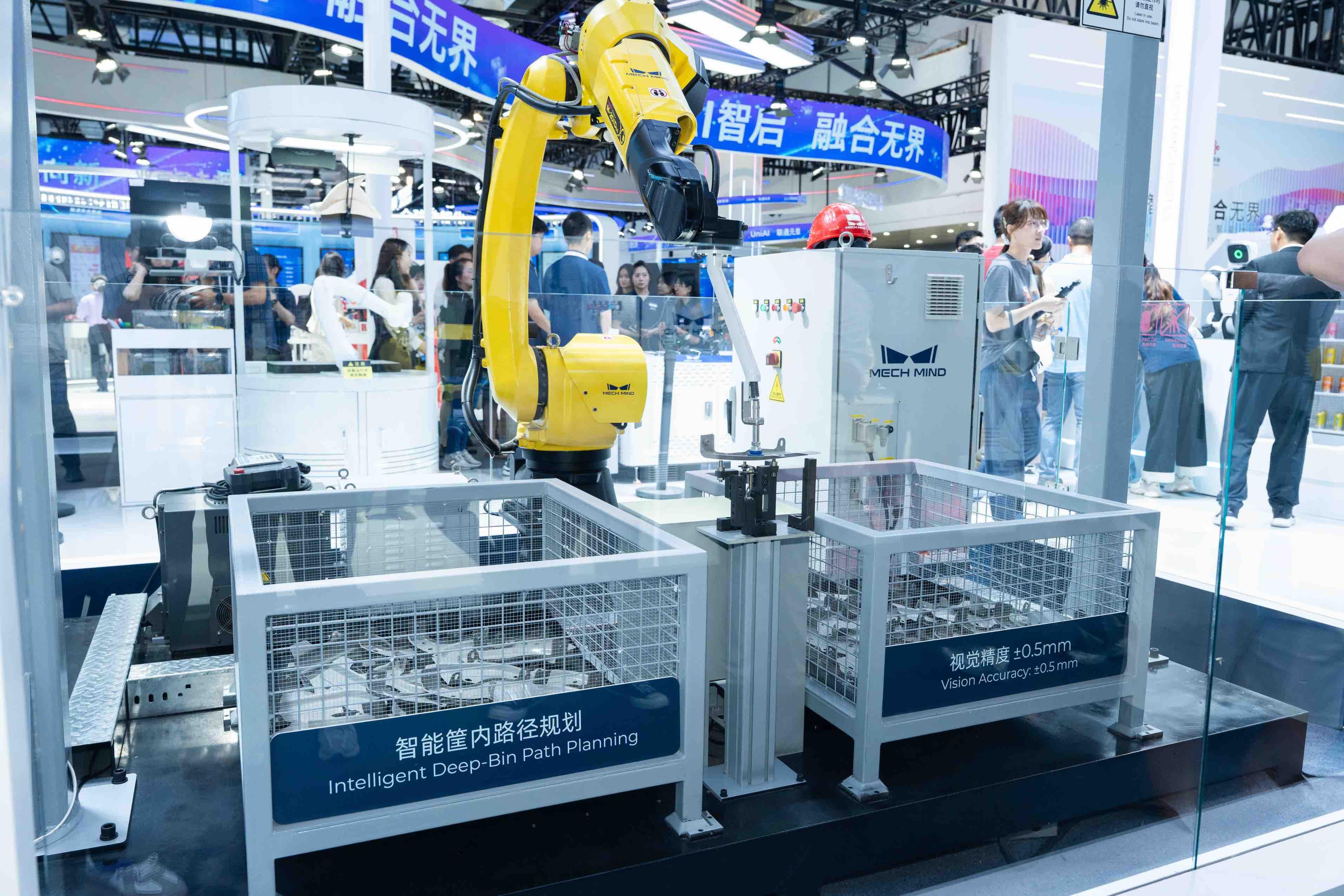 “梅卡曼德的AI視覺系統(tǒng)能夠應(yīng)對鈑金件反光、異形、亂序堆疊等復(fù)雜工況,在大于3米的距離下精準(zhǔn)識別鈑金件及其關(guān)鍵特征,視覺精度達(dá)±0.5毫米?!鄙厶焯m以WAIC 2025展臺(tái)中的AI視覺引導(dǎo)鈑金件深筐無序上料應(yīng)用場景為例解釋說。