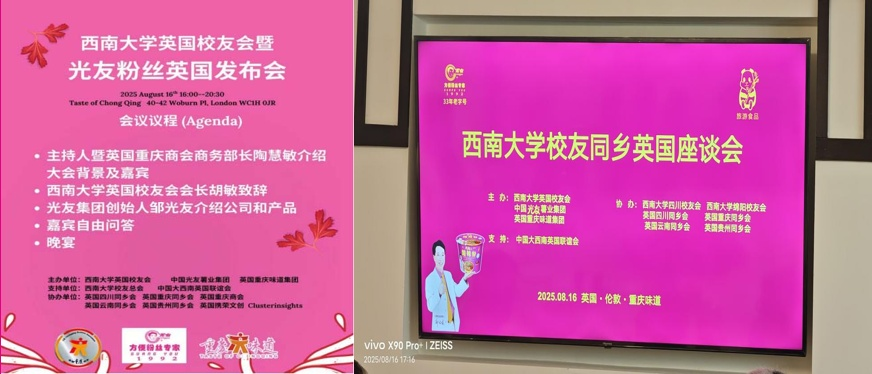 8月16日,光友粉絲團在倫敦重慶味道召開《西南大學(xué)英國校友會暨光友粉絲英國發(fā)布會》,來自中英兩國的西南大學(xué)校友及川渝云貴等企業(yè)家、科學(xué)家歡聚一堂,共敘鄉(xiāng)情、推動光友粉絲在英國大發(fā)展。