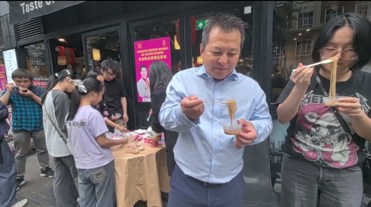 來自世界各地的消費者排起長隊爭相品嘗,嗦粉的“吸溜”聲此起彼伏?!癡ery good!”一位在英川渝同鄉(xiāng)邊吃邊贊嘆。更有消費者舉著裝有光友粉絲的品嘗杯,在倫敦街頭邊走邊嗦,成了一道獨特的風(fēng)景線。