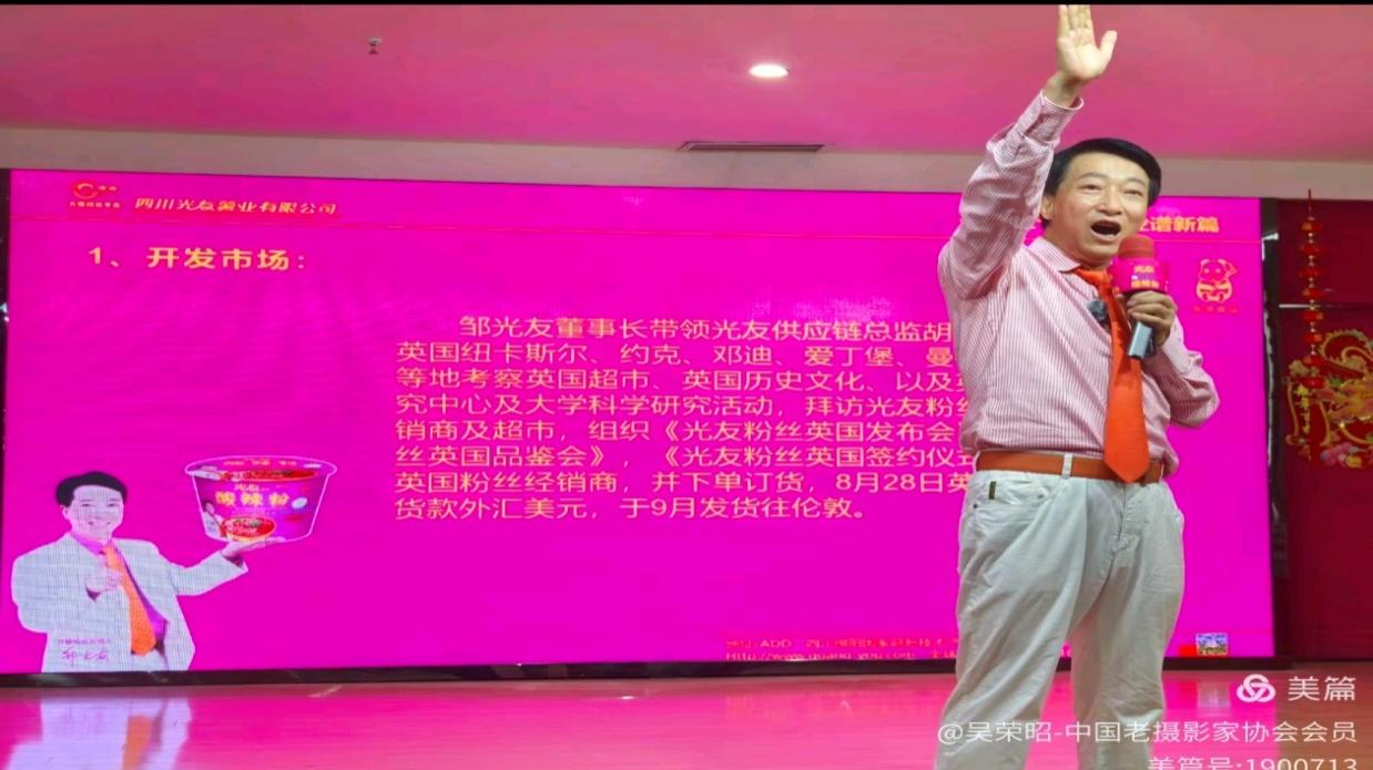 鄒光友到現(xiàn)場感悟發(fā)小視頻,說:“牛頓發(fā)現(xiàn)萬有引力,今天,人人有引力,每種商品有引力,光友酸辣粉在英國有引力。光友酸辣粉吸引了英國人、吸引了中國人、吸引了世界人、吸引了線上線下的各位粉絲寶寶,這就是相互吸引,這就是萬有引力的效應(yīng)。光友酸辣粉吸引英國朋友,英國朋友吸引了光友酸辣粉,人與人之間就有相互吸引力。”