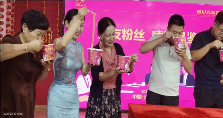 “嗦粉大賽,現(xiàn)在開啟!”主持人話音剛落,數(shù)十名參賽嘉賓迅速上場,面前擺放著光友低Gi酸辣粉;臺下嘉賓席,工作人員同步端上光友酸辣粉mini杯,臺上臺下形成“同步嗦粉”的熱鬧場景。哨聲響起,臺上選手專注角逐,有人用筷子高高挑起粉絲、有人用筷子快速卷粉入口、有人小口快咽確保湯汁不灑,全程嚴(yán)守“用時最短、碗底無湯”標(biāo)準(zhǔn);臺下嘉賓邊品嘗邊關(guān)注比賽,偶爾與身旁人交流:“你試試這個酸辣粉,嚼著有紅薯的綿甜”“酸辣粉的紅油飄香”,輕聲討論與臺上的細(xì)微吞咽聲交織,氛圍鮮活。