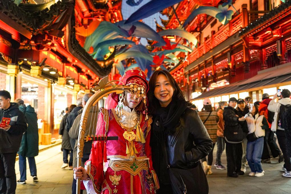 2024年11月30日,來自韓國(guó)的游客(右)在上海豫園商城與游戲角色裝扮者合影。新華社發(fā)(謝鑫攝)