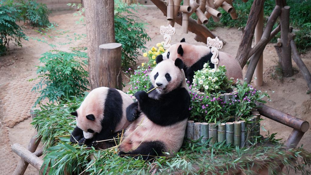 2025年7月7日,在韓國(guó)京畿道龍仁市愛寶樂園,大熊貓媽媽“愛寶”(中)和“睿寶”、“輝寶”在慶生活動(dòng)上享用美食。新華社發(fā)(孫一然攝)