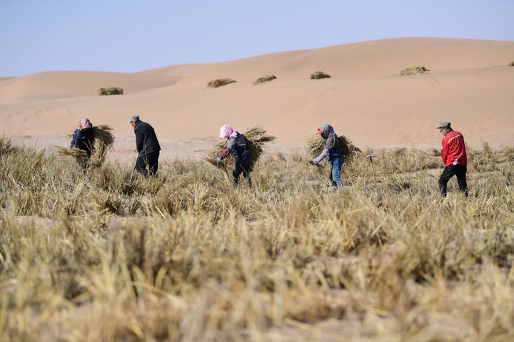 2025年2月28日,在巴丹吉林和騰格里兩大沙漠交匯處的阿拉善九棵樹項(xiàng)目區(qū),治沙工人用稻草在沙漠中扎草方格。新華社發(fā)(康文魁攝)