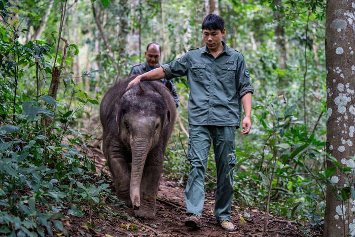 2024年12月8日,西雙版納亞洲象救護(hù)與繁育中心工作人員莫詩(shī)宇(右)、陳繼銘帶小象到野外開展訓(xùn)練。新華社記者 胡超 攝