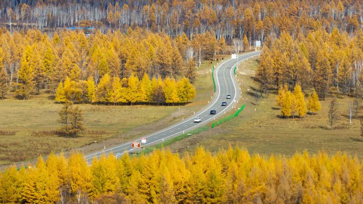 2025年9月29日,游客在內(nèi)蒙古阿爾山國(guó)家森林公園駕車游玩(無人機(jī)照片)。新華社記者 貝赫 攝
