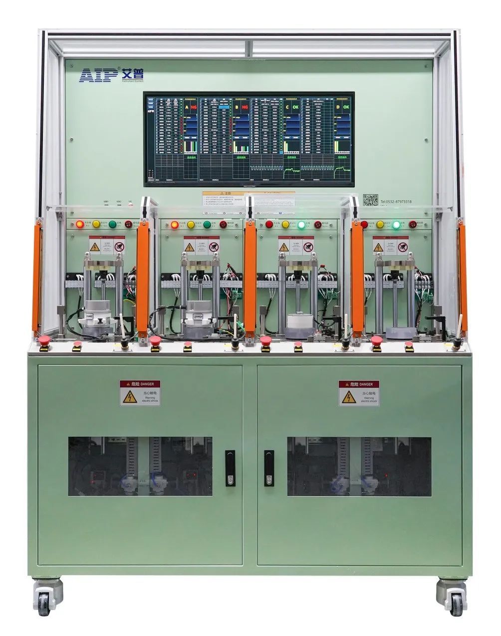 針對這一需求,艾普智能組建專業(yè)團隊,經(jīng)深入技術論證后,定制開發(fā)了一套四工位并行測試系統(tǒng)。該系統(tǒng)采用四工位同步測試設計,能夠?qū)崿F(xiàn)高效并行測試,可一次性完成負載測試、霍爾特性、反電動勢、轉(zhuǎn)速、轉(zhuǎn)向、缺相、交流耐壓、絕緣電阻等多項測試項目,大幅提升測試效率?;谀K化設計,一套設備即可滿足直流電機與交流電機的測試需求,顯著降低客戶設備采購與管理成本。此外,智能化管理方面,該設備支持與工廠MES系統(tǒng)對接,具備遠程診斷和軟件升級功能,可實現(xiàn)測試數(shù)據(jù)的實時上傳與分析,快速響應客戶需求。