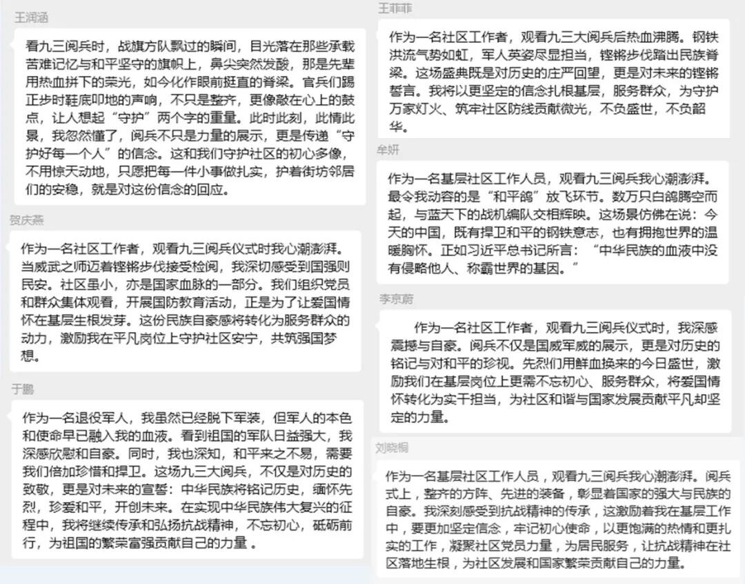 觀看結(jié)束,社區(qū)黨組織還特別設(shè)置了“初心分享”環(huán)節(jié)。黨員和群眾結(jié)合自身經(jīng)歷,暢談對(duì)歷史的理解、對(duì)當(dāng)下的感悟?!白鳛橐幻鶎由鐓^(qū)工作人員,我將繼續(xù)思為民服務(wù)之責(zé)、添干事創(chuàng)業(yè)之勁。今后,海越社區(qū)將把今天激發(fā)的澎湃熱情,轉(zhuǎn)化為扎根社區(qū)、服務(wù)居民的實(shí)際行動(dòng),以更加飽滿的熱情、更加務(wù)實(shí)的作風(fēng),投身到社區(qū)工作中,為筑牢黨的執(zhí)政根基、構(gòu)建和諧美好社區(qū)、實(shí)現(xiàn)中華民族偉大復(fù)興的中國(guó)夢(mèng)貢獻(xiàn)堅(jiān)定力量!”社區(qū)黨總支書記的發(fā)言引發(fā)共鳴。大家紛紛表示,要把閱兵式中感受到的愛(ài)國(guó)熱情和民族精神,轉(zhuǎn)化為服務(wù)群眾的實(shí)際行動(dòng),在化解鄰里矛盾、推進(jìn)基層治理、開(kāi)展志愿服務(wù)中踐行使命。