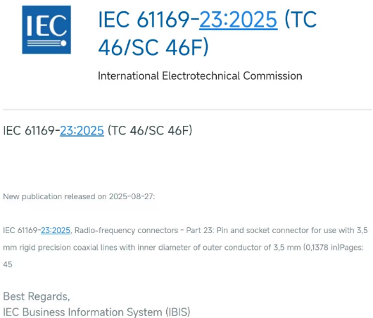 近日,從國(guó)際電工委員會(huì)(IEC)傳來(lái)令人振奮的消息:由蘇州華旃航天電器有限公司(以下簡(jiǎn)稱(chēng)“蘇州華旃”)主導(dǎo)制定的IEC61169-23:2025《射頻連接器第23部分:接3.5mm硬精密同軸線(xiàn)、外導(dǎo)體內(nèi)徑為3.5mm(0.1378in)的射頻同軸連接器》國(guó)際標(biāo)準(zhǔn)正式發(fā)布!這不僅是中國(guó)企業(yè)在國(guó)際射頻連接器領(lǐng)域話(huà)語(yǔ)權(quán)的重大突破,更是蘇州高新區(qū)以高標(biāo)準(zhǔn)助推高端裝備制造邁進(jìn)的新里程碑。