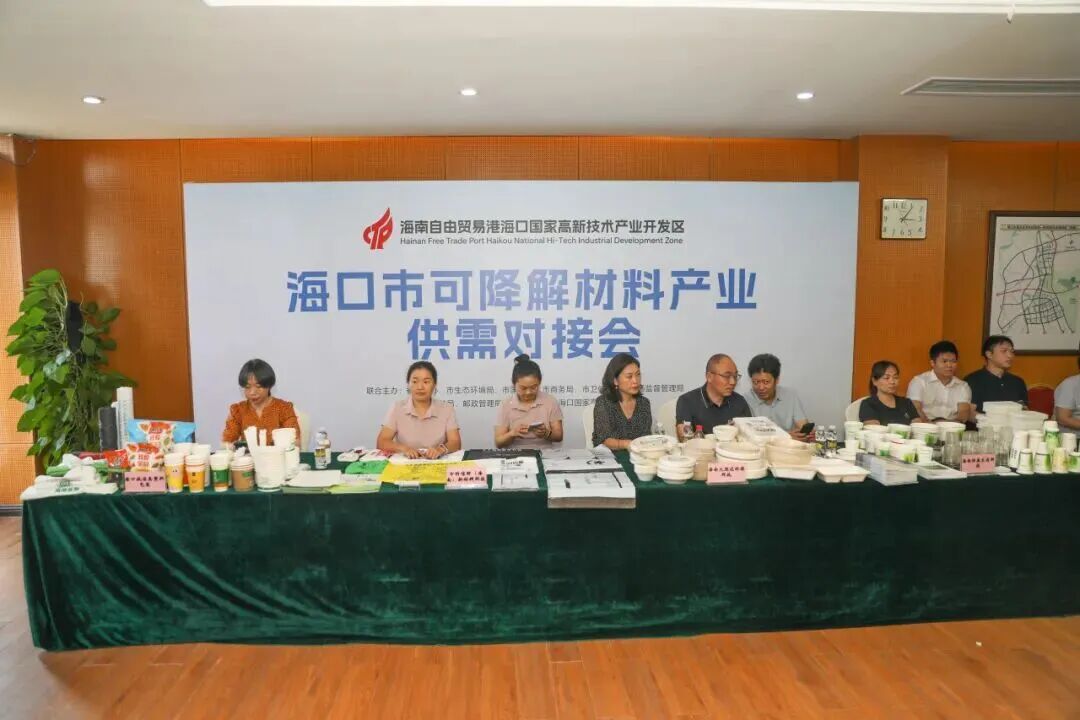 5月,??诟咝聟^(qū)聯(lián)合多部門舉辦的海口市可降解材料產(chǎn)業(yè)供需對接會(huì)在美安生態(tài)科技新城舉行,為園區(qū)8家可降解材料生產(chǎn)企業(yè)與海口市醫(yī)院診所、商超、餐飲、農(nóng)貿(mào)市場、物流企業(yè)等80余家企、事業(yè)單位代表搭建起合作交流的平臺(tái)。