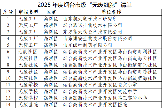近日,煙臺市生態(tài)環(huán)境局公示2025年度煙臺市級“無廢細胞”名單,煙臺高新區(qū)14家優(yōu)秀單位榜上有名,其中無廢工廠5家,無廢社區(qū)5家,無廢學校3家,無廢醫(yī)院1家。