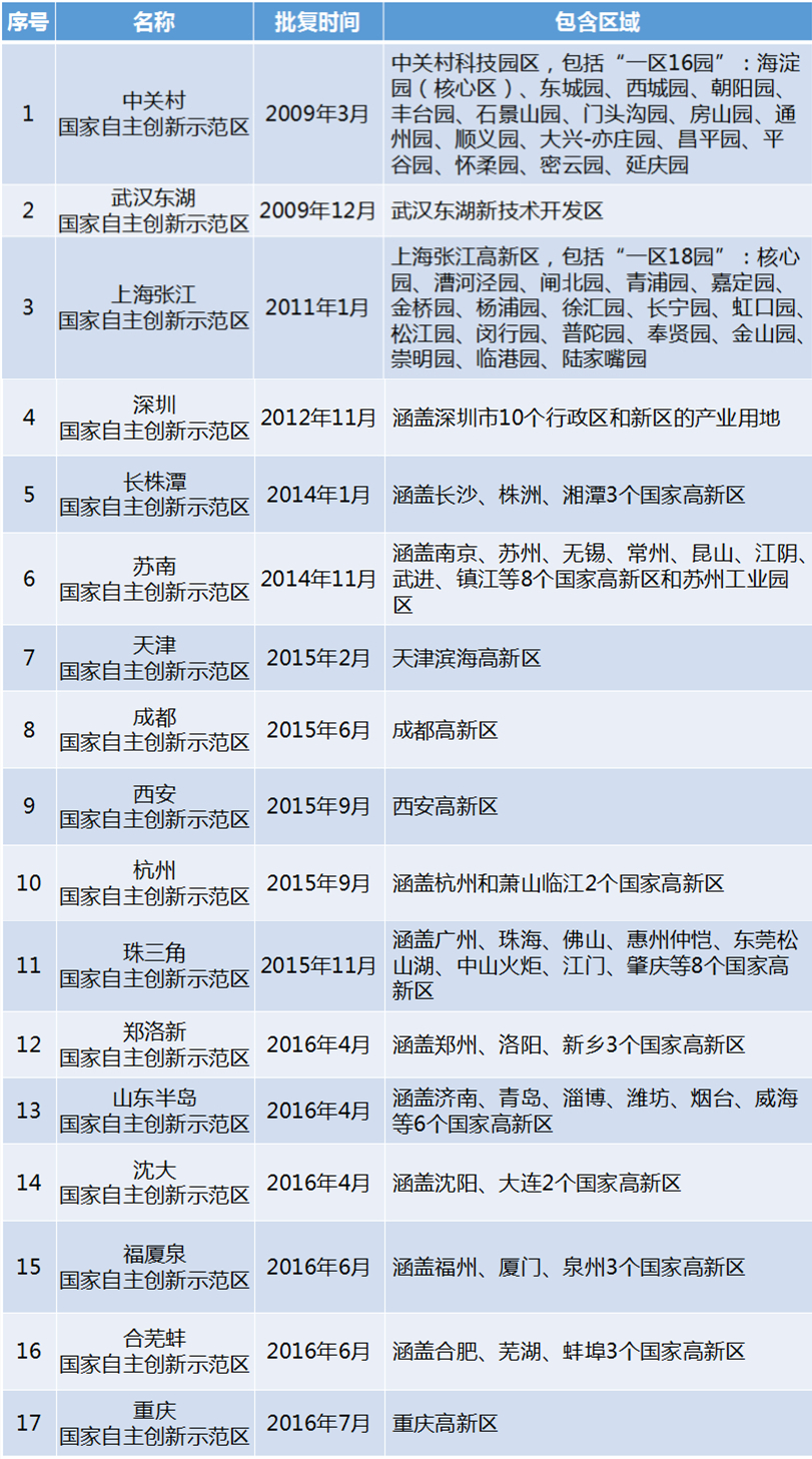 國家自主創(chuàng)新示范區(qū)是經(jīng)國務(wù)院批準(zhǔn),在推進(jìn)自主創(chuàng)新和高新技術(shù)產(chǎn)業(yè)發(fā)展方面先行先試、探索創(chuàng)新經(jīng)驗、做出示范的區(qū)域,是新時期我國實施創(chuàng)新驅(qū)動發(fā)展戰(zhàn)略的重大舉措。自2009年3月中關(guān)村國家自創(chuàng)區(qū)成立以來,至今國務(wù)院已批復(fù)成立了17家國家自創(chuàng)區(qū),涉及47家國家高新區(qū),形成了以國家高新區(qū)為主要發(fā)展載體的構(gòu)架。