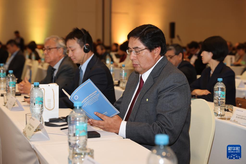 11月8日,在秘魯首都利馬,嘉賓翻閱智庫(kù)報(bào)告。新華社記者 李夢(mèng)馨 攝