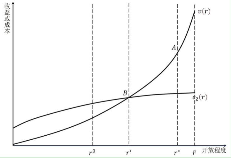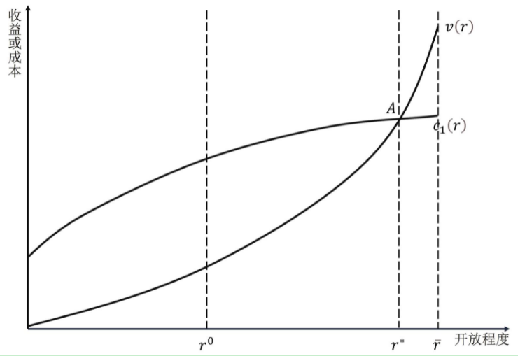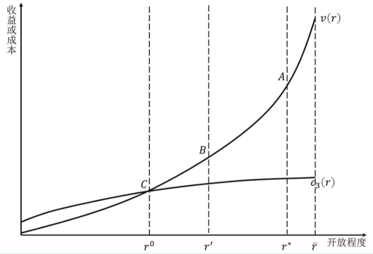 通過(guò)簡(jiǎn)單的成本收益模型,可以解釋當(dāng)前公共數(shù)據(jù)開(kāi)放程度不足的原因。假設(shè)公共數(shù)據(jù)開(kāi)放的社會(huì)收益為υ(r),成本為с(r),其中,r為公共數(shù)據(jù)的開(kāi)放程度, 為因安全和隱私限制所能達(dá)到的開(kāi)放上限。