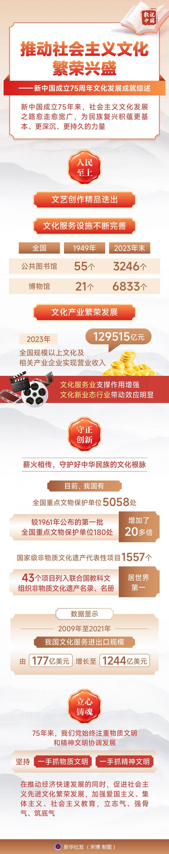 國家之魂,文以化之,文以鑄之。75年來,我國著力建設(shè)中華優(yōu)秀傳統(tǒng)文化傳承發(fā)展體系,積極推進(jìn)文物保護(hù)利用和文化遺產(chǎn)保護(hù)傳承工作,以自信開放的姿態(tài)更好推動中華文化走出去,中華文化煥發(fā)新的時代光彩。