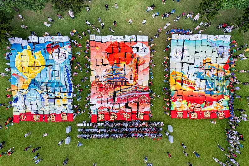10月1日,在香港中山紀(jì)念公園,180余所學(xué)校的約千名師生家長共同拼出3幅巨型拼圖:愛我中華、富強(qiáng)盛世、心系祖國。新華社發(fā)(受訪者供圖)