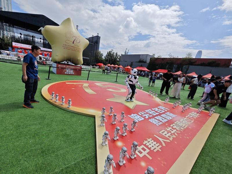 10月1日,香港油尖旺區(qū)各界在西九文化區(qū)組織了一場文化和科技交織的慶典。圖為慶典上展示的機(jī)器人。新華社記者 褚萌萌 攝