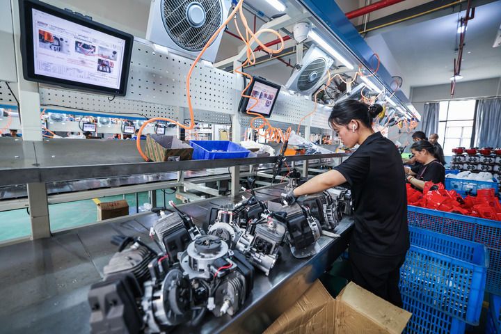 2024年8月14日,在浙江省金華市金東區(qū)曹宅鎮(zhèn)的浙江托馬斯工具制造有限公司數(shù)字化車間內(nèi),工人在流水線上生產(chǎn)出口的園林機(jī)械。近年來,金華市金東區(qū)大力推動數(shù)字化改造,聚焦智能家居、電動(園林)工具等主導(dǎo)行業(yè),以場景應(yīng)用帶動“智改數(shù)轉(zhuǎn)網(wǎng)聯(lián)”項(xiàng)目建設(shè)。新華社記者 徐昱 攝
