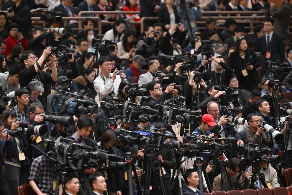 3月5日,十四屆全國人大三次會議開幕會在北京人民大會堂舉行。這是記者在會場采訪。