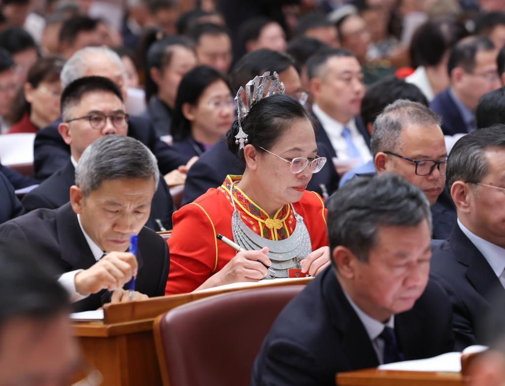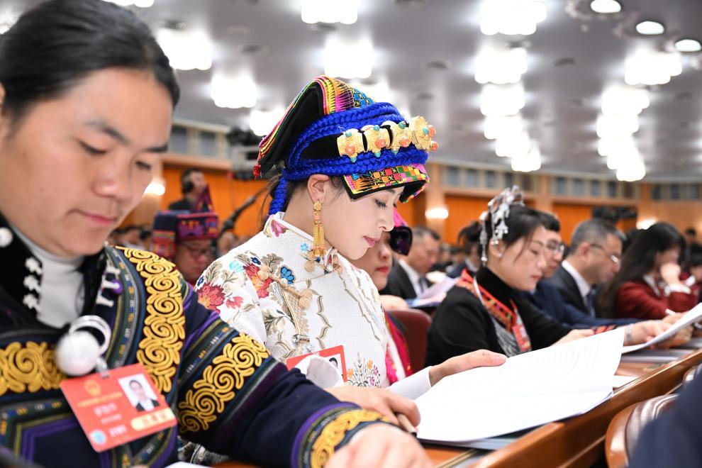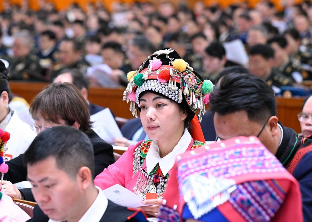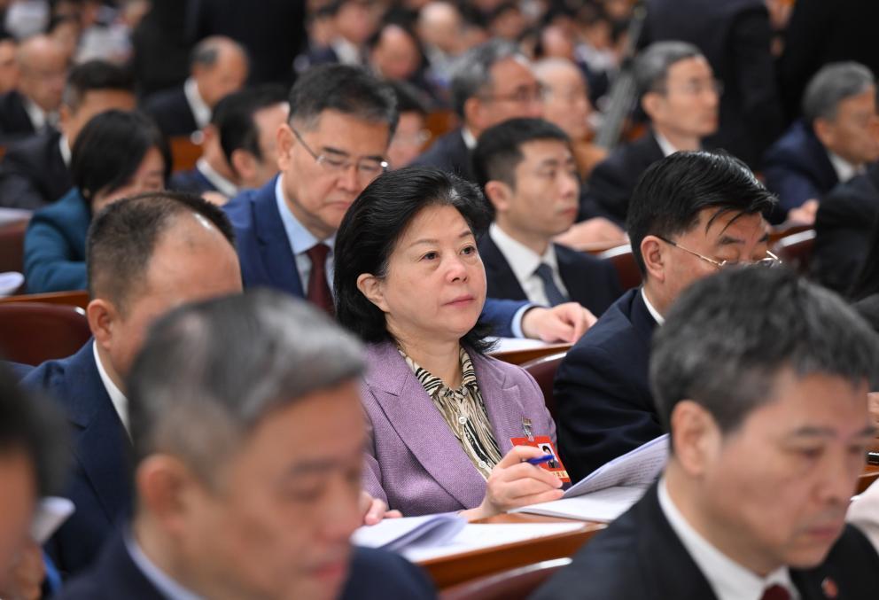 3月5日,全國人大代表魯麗華(中)在十四屆全國人大三次會議開幕會上聽會。