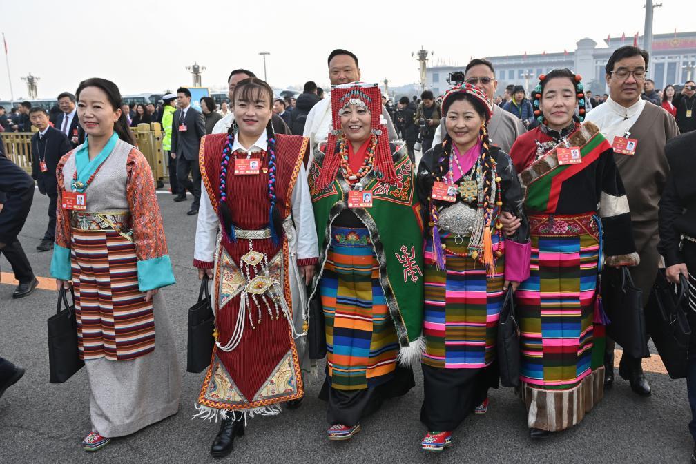 3月5日,全國人大代表格西王姆(左二)在十四屆全國人大三次會議開幕會上聽會。