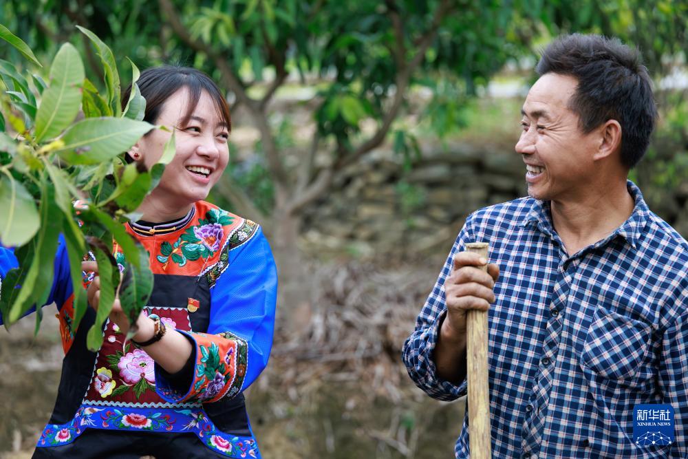 全國人大代表、貴州省安順市鎮(zhèn)寧布依族苗族自治縣六馬鎮(zhèn)致富村黨支部書記、村委會主任盧丹(左)在致富村向村民劉發(fā)志了解芒果種植情況(2025年2月20日攝)。