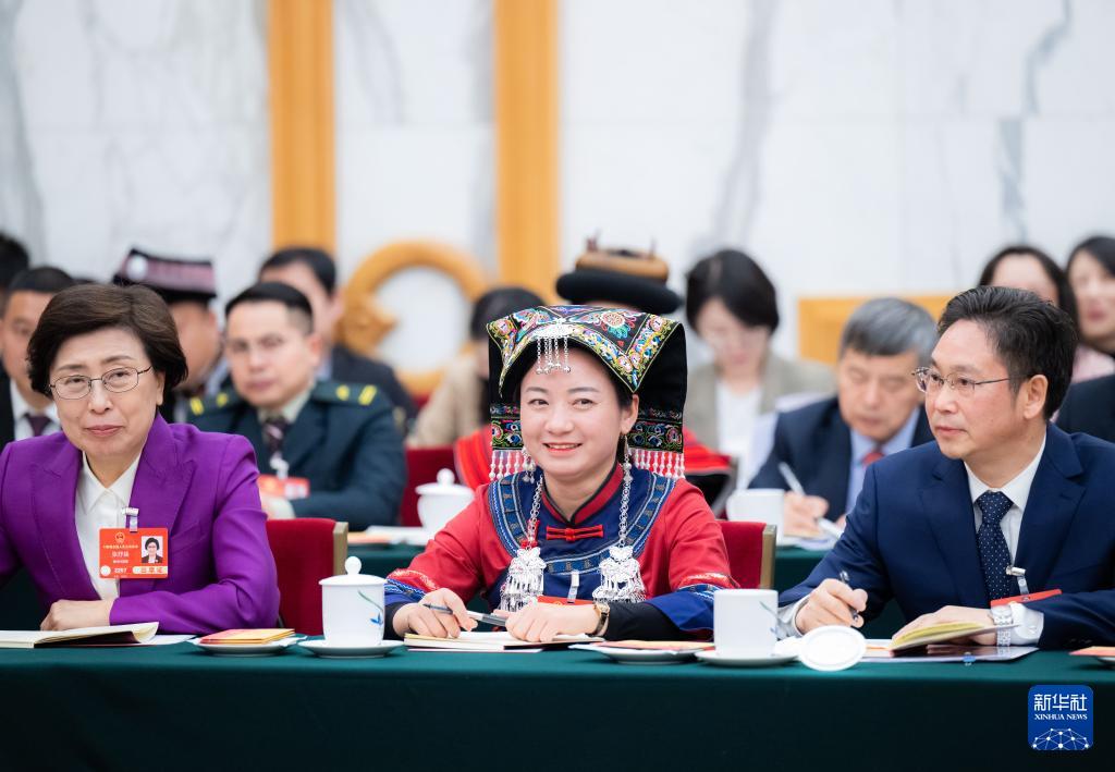 3月5日,全國人大代表、貴州省安順市鎮(zhèn)寧布依族苗族自治縣六馬鎮(zhèn)致富村黨支部書記、村委會主任盧丹(中)在北京出席十四屆全國人大三次會議貴州代表團全體會議。