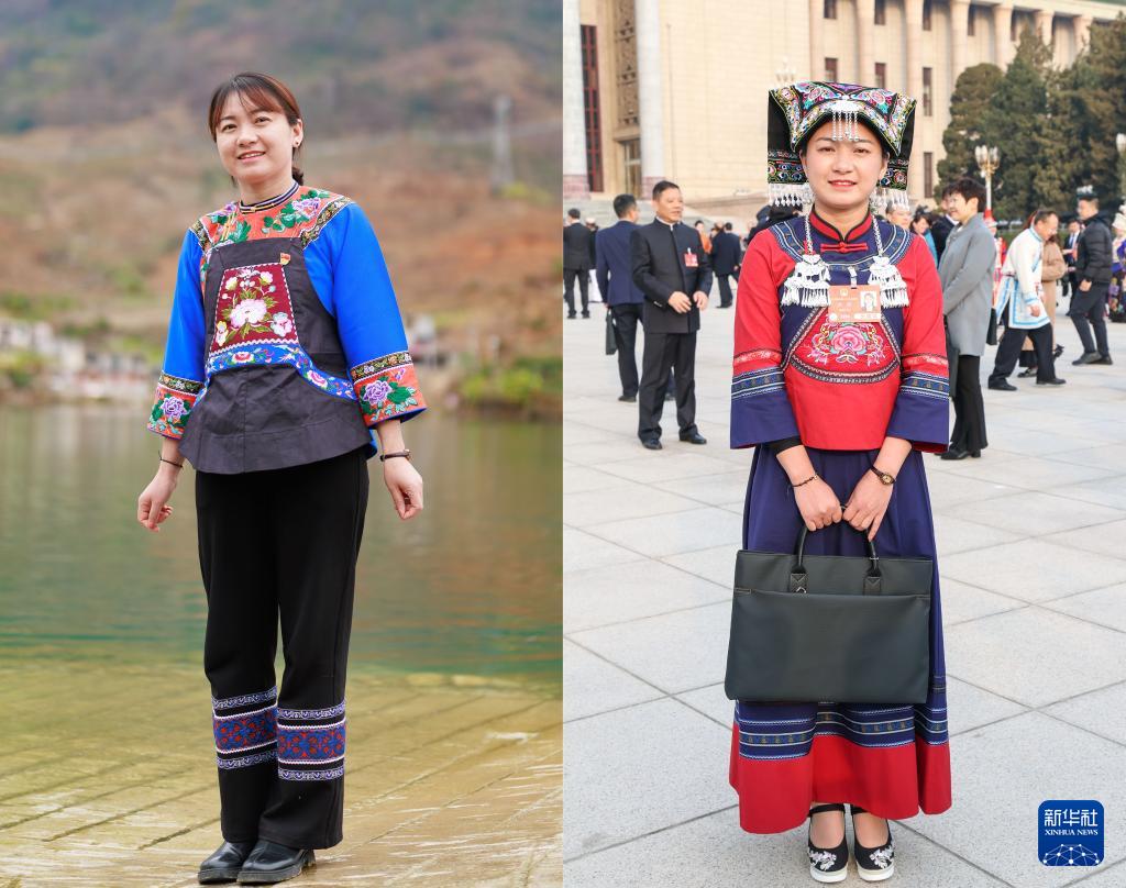 拼版照片:左圖為在貴州省安順市鎮(zhèn)寧布依族苗族自治縣六馬鎮(zhèn)致富村拍攝的全國人大代表、鎮(zhèn)寧布依族苗族自治縣六馬鎮(zhèn)致富村黨支部書記、村委會主任盧丹(新華社記者劉續(xù)2025年2月20日攝);右圖為在北京人民大會堂外拍攝的盧丹(新華社記者呂帥2025年3月5日攝)。