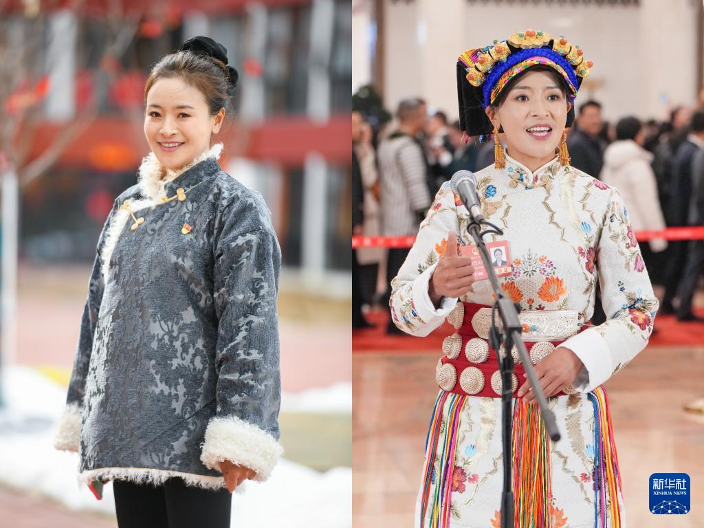 拼版照片:左圖為在云南省南澗彝族自治縣寶華鎮(zhèn)擁政村拍攝的全國人大代表、南澗彝族自治縣民族文化工作隊隊員魯麗華(新華社記者陳欣波2025年2月7日攝);右圖為在十四屆全國人大三次會議云南代表團駐地拍攝的魯麗華(新華社記者鄭煥松2025年3月6日攝)。