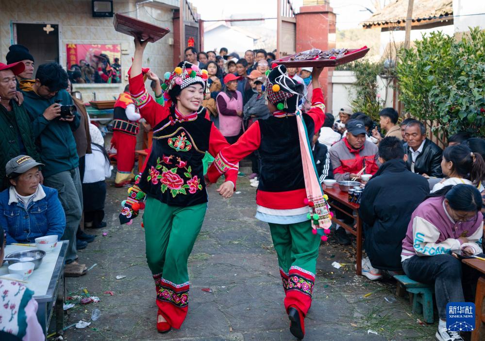 全國人大代表、云南省南澗彝族自治縣民族文化工作隊隊員魯麗華(前左)在南澗彝族自治縣寶華鎮(zhèn)擁政村表演跳菜(2025年2月7日攝)。