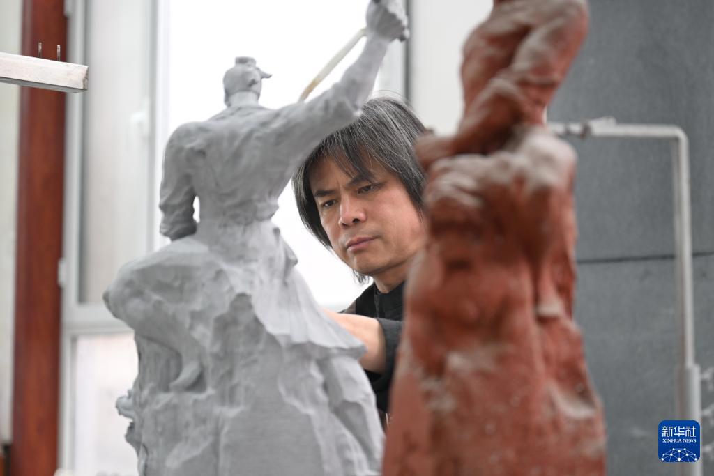 全國政協(xié)委員、河北翰鼎雕塑集團首席技師高英坡在河北省曲陽縣的工作室進行雕塑創(chuàng)作(2025年2月21日攝)。