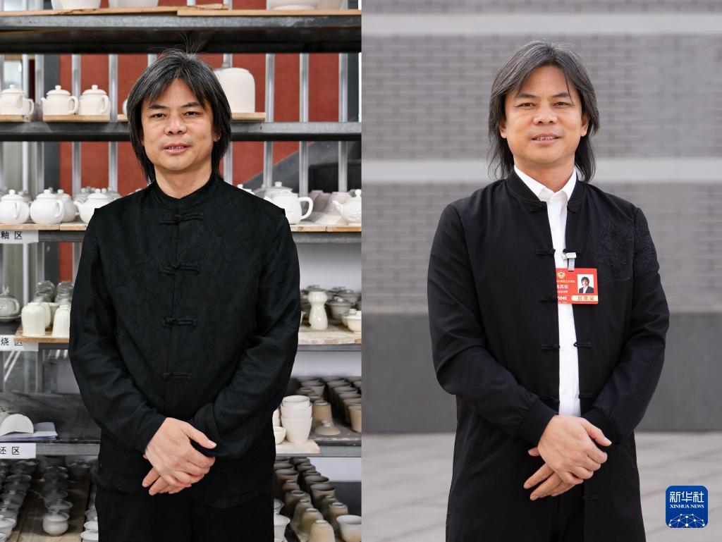 拼版照片:左圖為在河北省曲陽縣拍攝的全國政協(xié)委員、河北翰鼎雕塑集團首席技師高英坡(新華社記者牟宇2025年2月21日攝);右圖為在北京的駐地拍攝的高英坡(新華社記者周荻瀟2025年3月6日攝)。