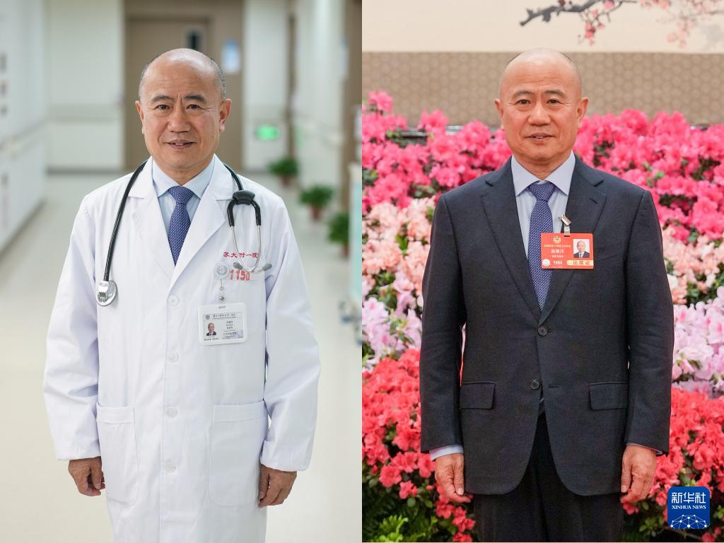 拼版照片:左圖為在蘇州大學附屬第一醫(yī)院拍攝的全國政協(xié)委員、蘇州大學附屬第一醫(yī)院血液科主任吳德沛(新華社記者季春鵬2025年2月17日攝);右圖為在北京人民大會堂拍攝的吳德沛(新華社記者周荻瀟2025年3月4日攝)。
