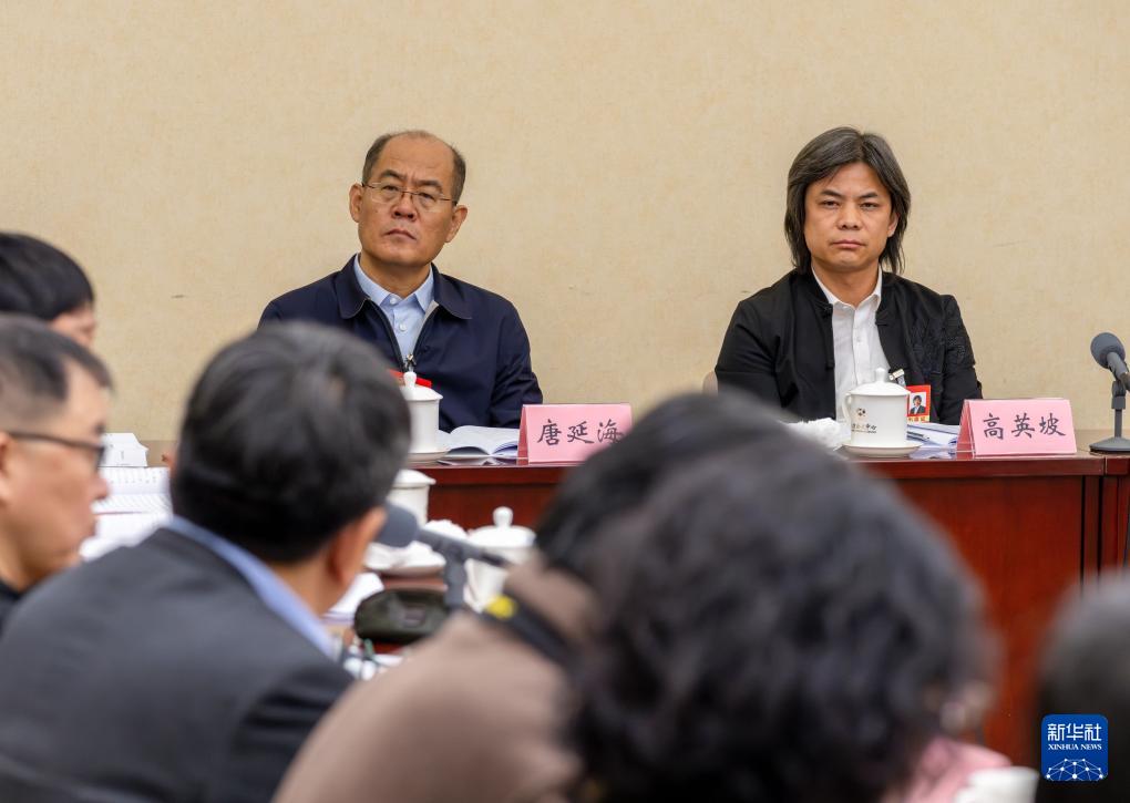 3月6日,全國政協(xié)委員、河北翰鼎雕塑集團首席技師高英坡(右一)在北京的駐地參加文化藝術界小組討論。