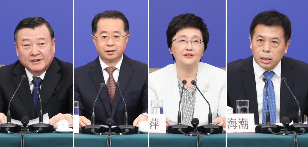 3月9日,十四屆全國人大三次會議在北京梅地亞中心新聞發(fā)布廳舉行記者會。民政部部長陸治原(左二)、人力資源和社會保障部部長王曉萍(右二)、住房和城鄉(xiāng)建設(shè)部部長倪虹(左一)、國家衛(wèi)生健康委員會主任雷海潮(右一)就民政、就業(yè)和社會保障、住房、衛(wèi)生健康等相關(guān)問題回答中外記者提問(拼版照片)。