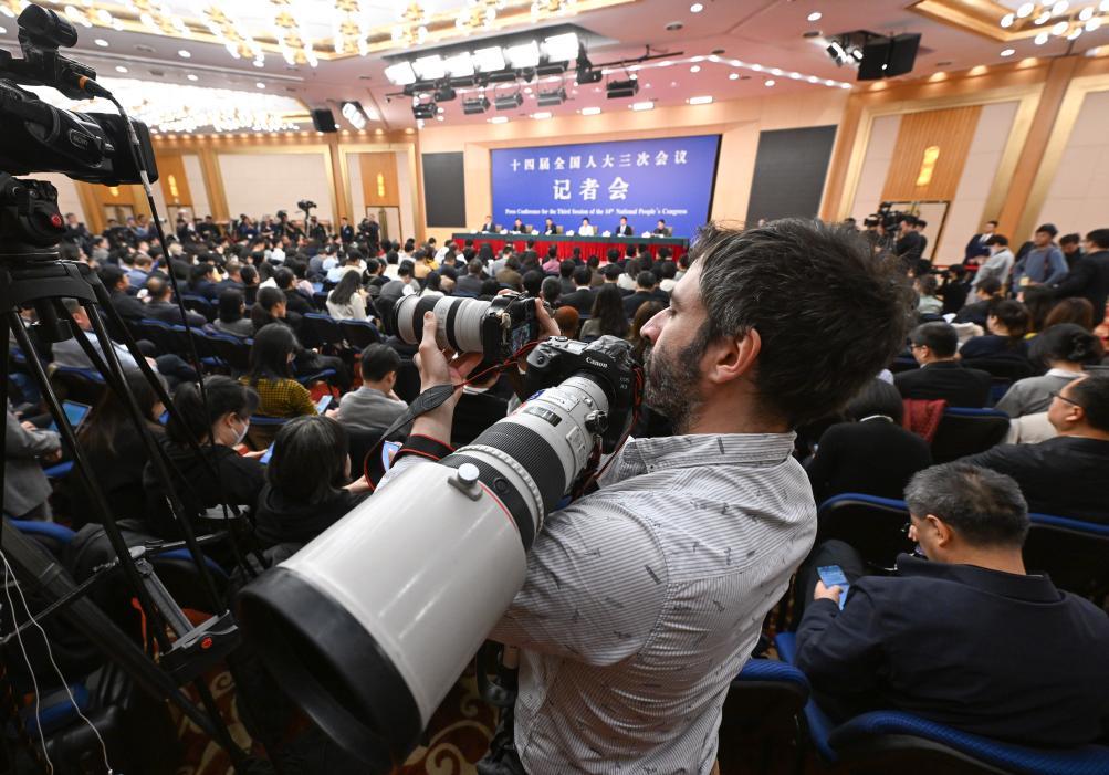 3月9日,十四屆全國人大三次會議在北京梅地亞中心新聞發(fā)布廳舉行記者會。民政部部長陸治原、人力資源和社會保障部部長王曉萍、住房和城鄉(xiāng)建設(shè)部部長倪虹、國家衛(wèi)生健康委員會主任雷海潮就民政、就業(yè)和社會保障、住房、衛(wèi)生健康等相關(guān)問題回答中外記者提問。這是記者在現(xiàn)場采訪拍攝。