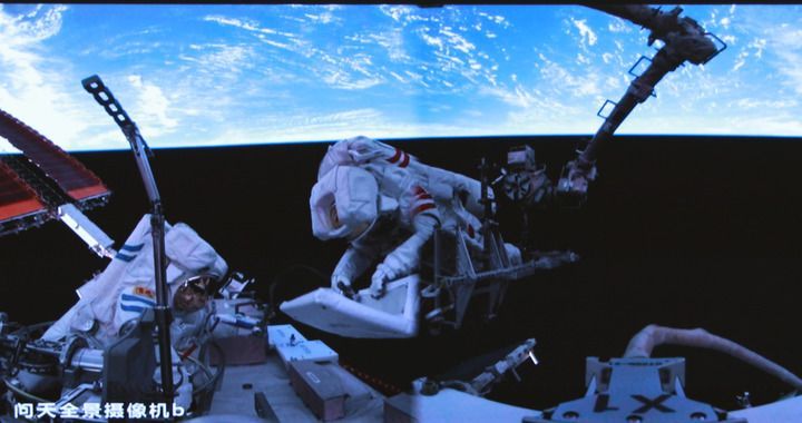 這是2025年6月26日在北京航天飛行控制中心屏幕上拍攝的神舟二十號(hào)航天員陳冬(左)與陳中瑞在空間站組合體艙外工作的畫(huà)面。新華社發(fā)(周柯毅攝)