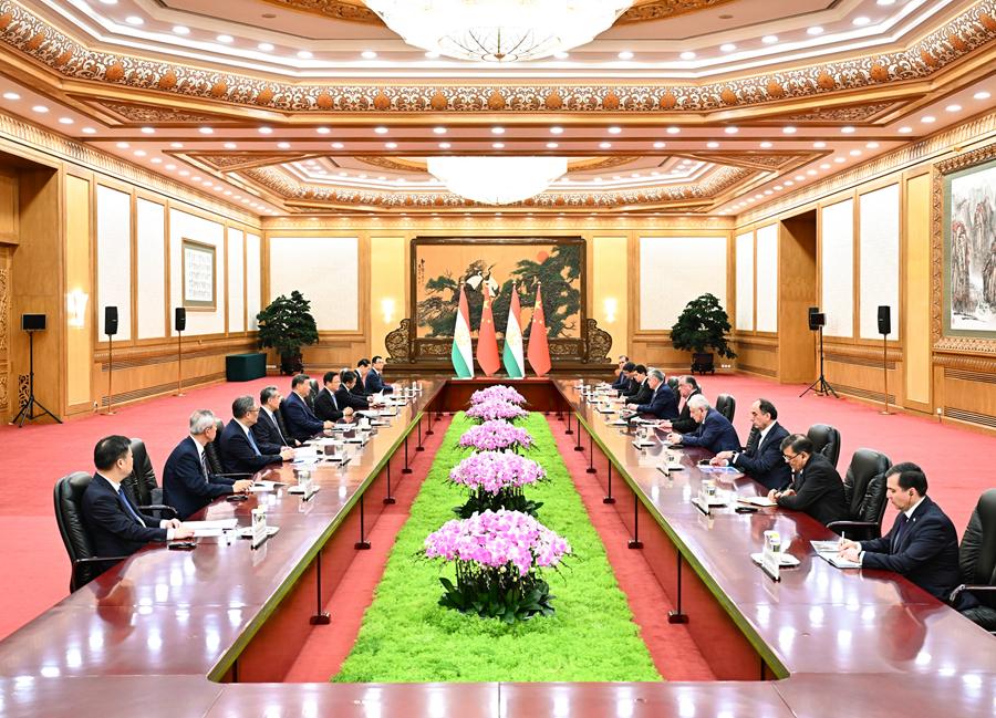 9月2日晚,國家主席習近平在北京人民大會堂會見來華出席2025年上海合作組織峰會和紀念中國人民抗日戰(zhàn)爭暨世界反法西斯戰(zhàn)爭勝利80周年活動的塔吉克斯坦總統(tǒng)拉赫蒙。新華社記者 燕雁 攝