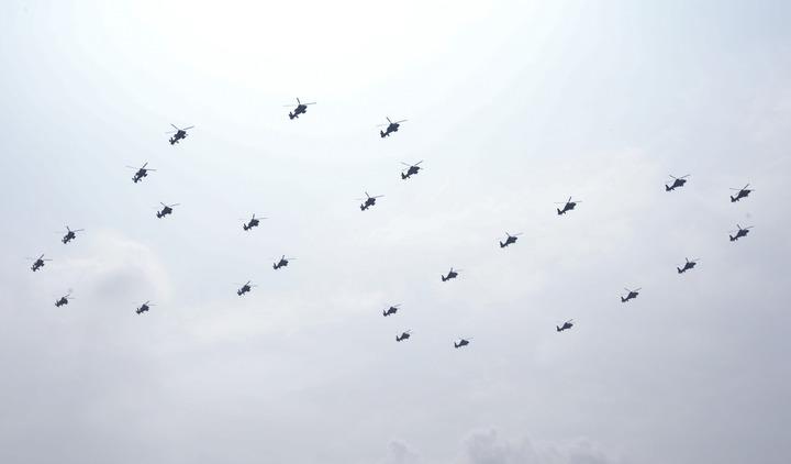 9月3日,紀(jì)念中國(guó)人民抗日戰(zhàn)爭(zhēng)暨世界反法西斯戰(zhàn)爭(zhēng)勝利80周年大會(huì)在北京隆重舉行。這是空中護(hù)旗梯隊(duì)通過(guò)天安門廣場(chǎng),26架直-19武裝直升機(jī)組成“80”字樣。新華社記者 陳曄華 攝